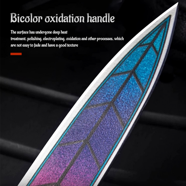 Bladet är tillverkat av rostfritt stål och har en böjd design som kombinerar skärkraft och skäreffektivitet. Dess skärpa gör det enkelt att det skär igenom fallskärmslinor, vilket gör det idealiskt för hantering av trä och mat i naturen. Den titanbelagda ytan förbättrar korrosionsbeständigheten och säkerställer att det inte rostar ens vid användning till sjöss.