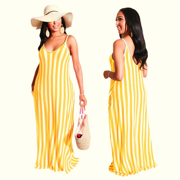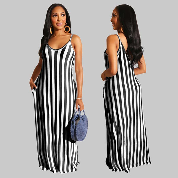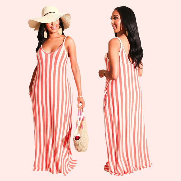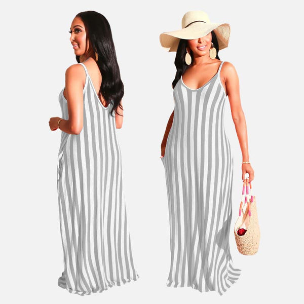 STILIG RANDIG DESIGN: Ett klassiskt randigt mönster ger en touch av elegans och avslappnad stil, vilket gör den här klänningen perfekt för sommarutflykter, stranddagar eller vardagsbruk.