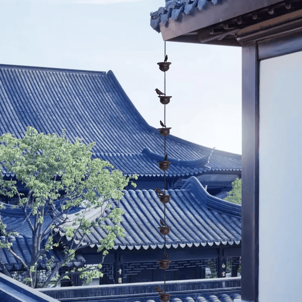 Ge din trädgård eller uteplats charm, ljud och rörelse med denna dekorativa regnkedja med åtta elegant utformade fågelbadkoppar. Oavsett om det regnar eller är soligt erbjuder den här pjäsen en unik blandning av praktisk regnvattenhantering och lugnande estetik som förhöjer alla utomhusutrymmen.