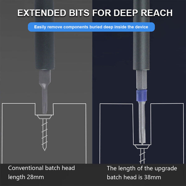 De uppgraderade lÄnga bitsen gör det enklare att nÄ och skruva loss komponenter som Àr djupt begravda i enheter. Perfekt för smartphones, bÀrbara datorer, klockor och andra precisionsinstrument.